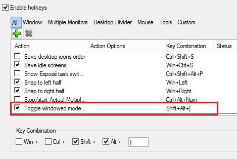 To activate windowed mode for an active Modern app, press the Win-Shift-Alt-] hotkey combination (by default). To change this combination, go to the Hotkeys tab in the configuration window of Actual Multiple Monitors. Find the "Toggle windowed mode for a Modern app" action and set the desired combination.