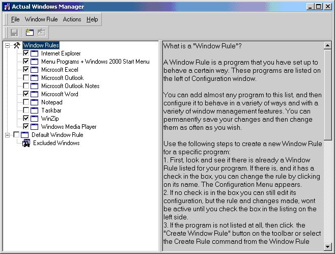 Basically, a Windows Rule is a set of behaviours you define for a specific window, be it an application, the windows task bar, the start menu or even title menus etc ... So, using this application, you can totally change how each one works in several categories: