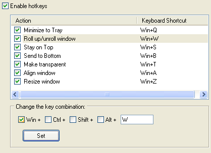 Now you can minimize programs to the system tray, always keep them on top, roll up windows, make them semitransparent, etc. by means only one keystroke combination.